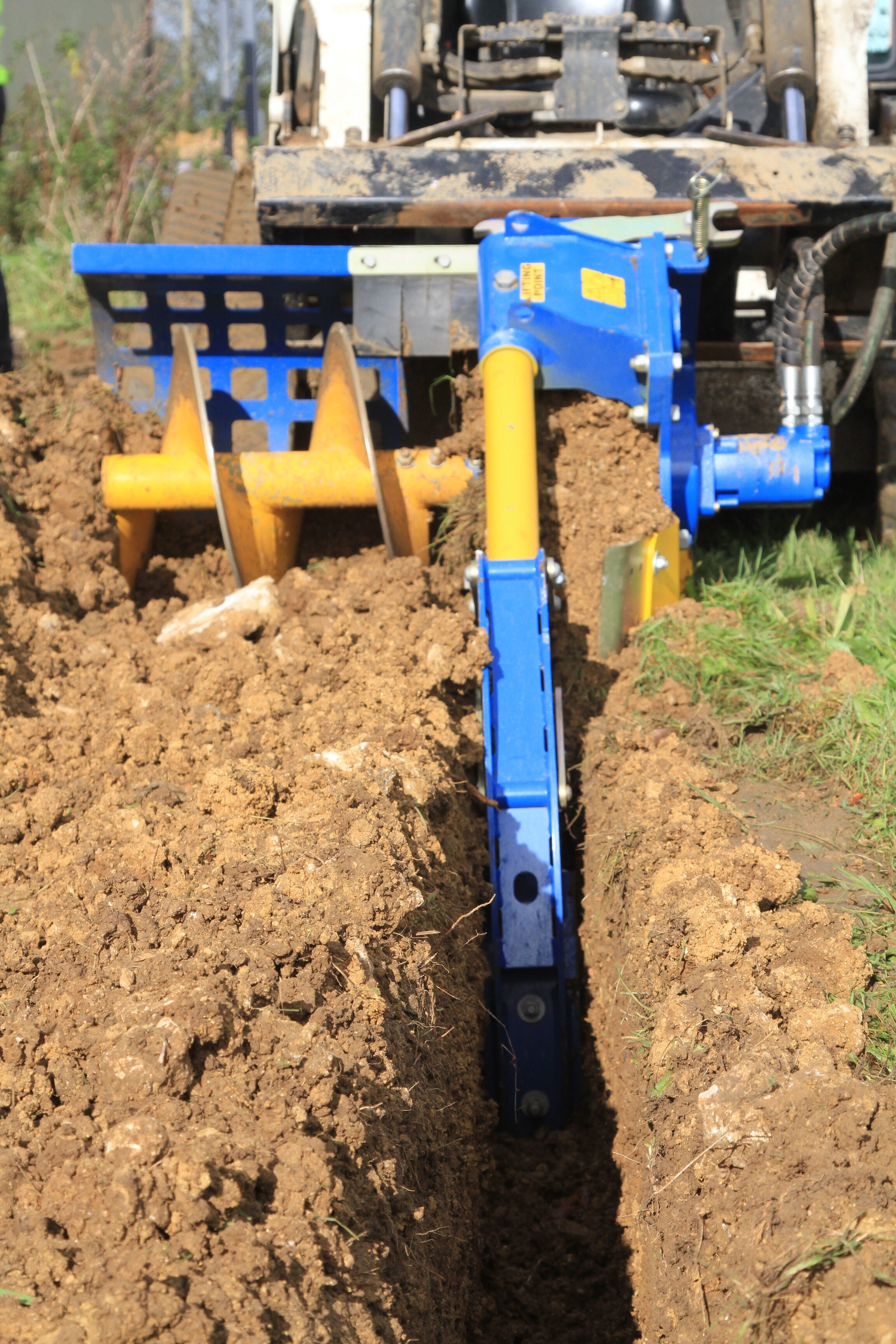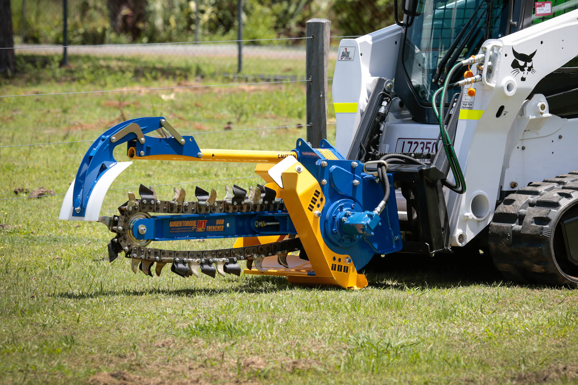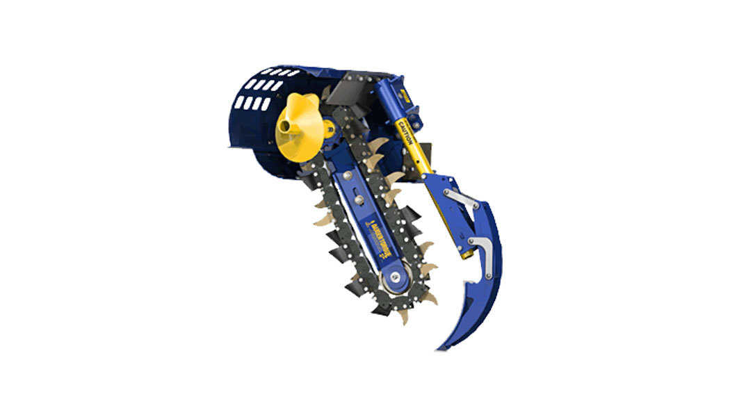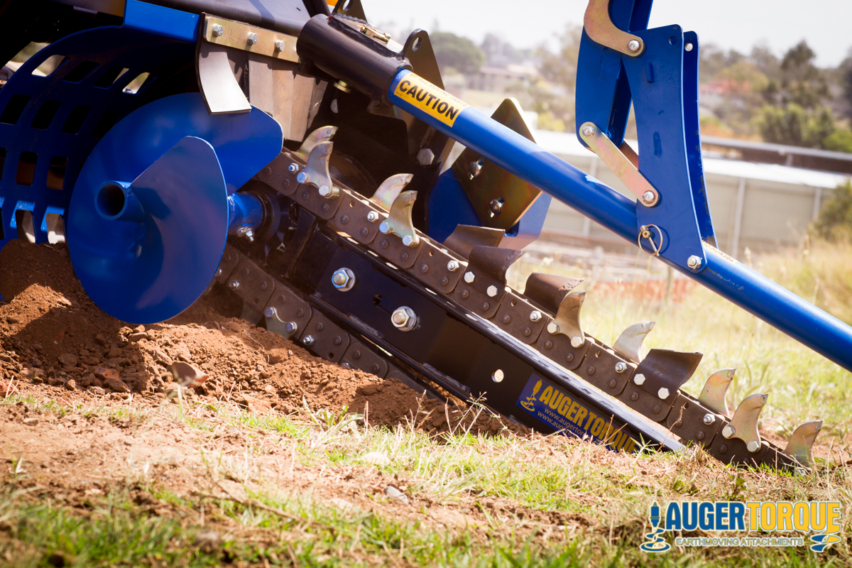 TRANCHEUSE AUGER TORQUE MT600 Pour chargeuses compactes et pelles de 2,5 à 4,5 T, avec système de nettoyage de la tranchée et flexibles. Pour tranchées de 300 à 600 de profondeur. Options de chaîne: 100mm, 150mm et, 200mm Nécessite un débit minimum de 35l à 65 lpm pour une pression de 160 à 240 bars. Fourni avec flexibles.