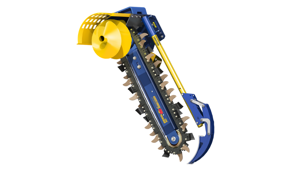 TRANCHEUSE XHD 1200 AUGER TORQUE Pour tractopelles, chargeur compact et pelle de 5 à 10 T avec système de nettoyage de la tranchée et flexibles. Pour tranchées de 800 à 1200mm de profondeur Options de chaîne 150mm - 200mm - 250mm - 300mm de large Nécessite un débit minimum de 70 - 110l/min pour une pression de 180 à 240 bars. Fourni avec flexibles