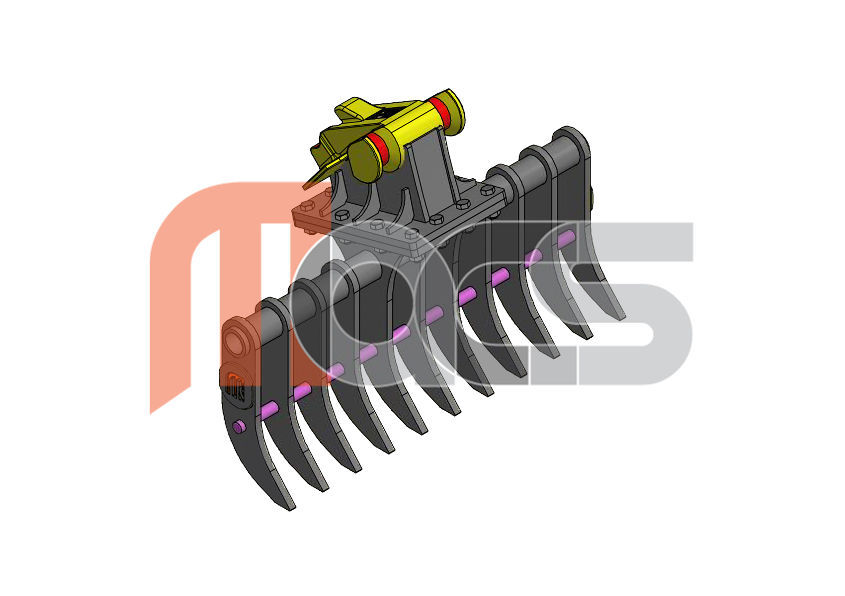 MACS Râteau pour machine jusqu'à 1,8 tonnes Largueur 950mm, 11 dents Épaisseur de dents = 16mm, espacement entre les dents = 75mm Poids approx 72kg Fourni prêt à travailler avec attache Morin ADAPTABLE Variatic M0
