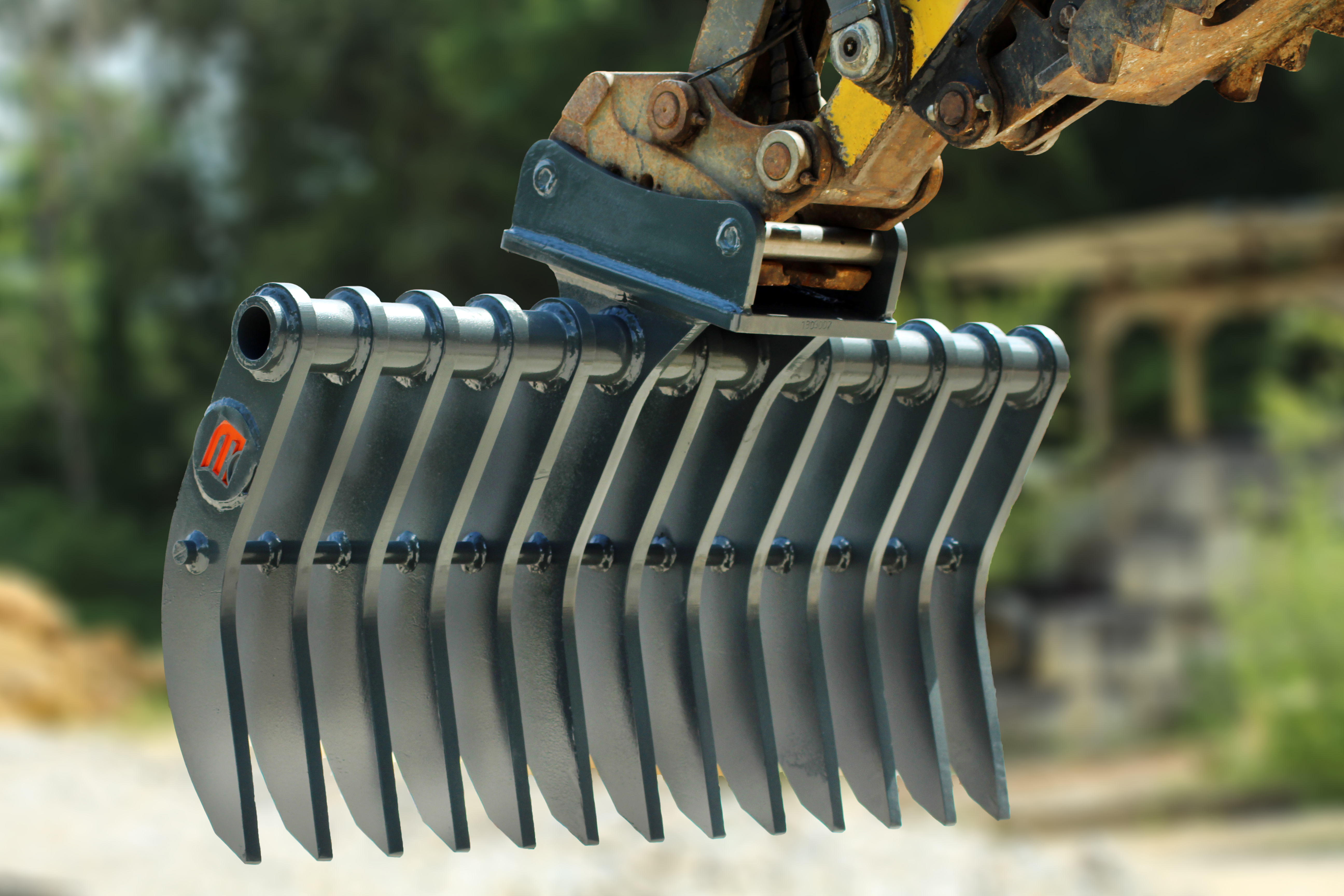 MACS Râteau pour machine jusqu'à 3,9 tonnes Largueur 1200mm, 13 dents Épaisseur de dents = 20mm, espacement entre les dents = 75mm Poids approx 159kg Fourni prêt à travailler avec attache Morin ORIGINE M2