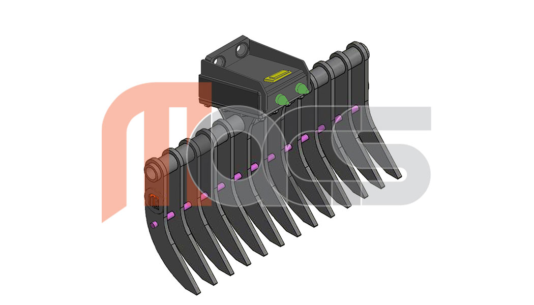 MACS Râteau pour machine jusqu'à 3,9 tonnes Largueur 1200mm, 13 dents Épaisseur de dents = 20mm, espacement entre les dents = 75mm Poids approx 159kg Prêt à travailler avec attache Volvo / Mecalac à tétons pour Volvo EC35 EC45