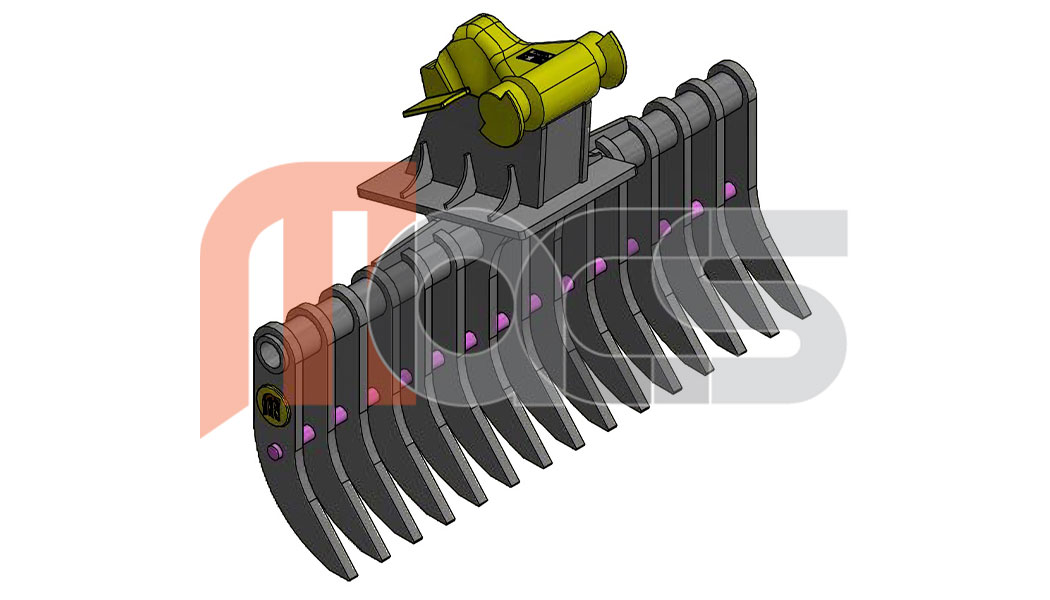 MACS Râteau pour machine jusqu'à 9 tonnes Largueur 1550mm, 16 dents Épaisseur de dents = 25mm, espacement entre les dents = 75mm Poids approx 292kg Fourni prêt à travailler avec attache Morin ADAPTABLE Variatic M3