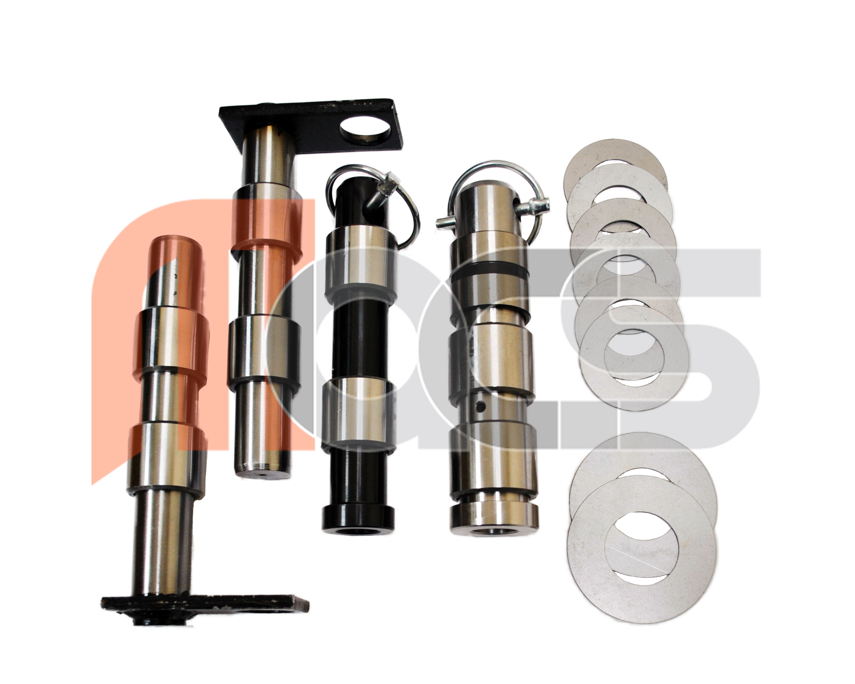 KIT GODET AXE ET BAGUE 8/9/10/11/10 Vérin. Ce kit comprend : - Les axes positions : 8, 9, 10, 11 (4 au total). - Les bagues positions : 8, 9, 10, 11 et 10 vérin (9 au total). - Les rondelles positions : 8, 9, 10, 11 (8 au total). - 2 goupilles. Dimensions des axes 9 et 11 à vérifier pour toute autre attache rapide autre que standard 2 axes : Diamètre 25mm - Longueur total de sous la tête : 164mm -Tête rectangulaire avec trou de 25mm de diamètre -Entraxe du trou et de l'axe sur la tête : 44mm.