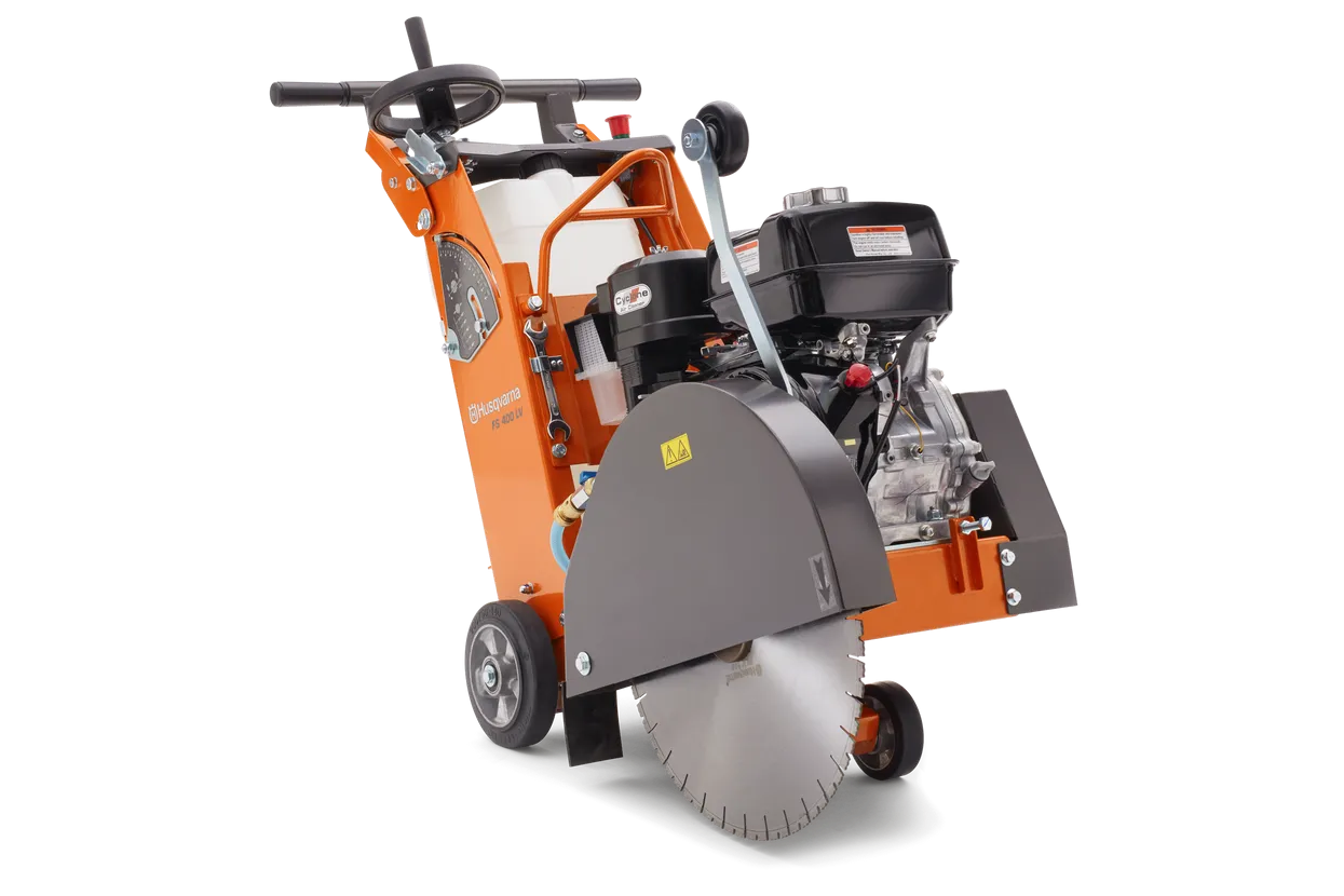 Scie à sol à essence FS 400 LV - diamètre 450 mm - 965148201 ·Alimentation : Essence moteur Honda ·Puissance: 8,7 kW ·Caractéristiques : Robuste, maniable, polyvalente ·Guidon : Réglable pour une posture de travail ergonomique ·Poids : 99kg, répartition optimisée pour une excellente stabilité ·Utilisation : Réparations de routes en béton ou asphalte ·Profondeur de coupe : Jusqu'à 162 mm ·Transport : Facile, avec poignées rétractables ·Performances : Faibles vibrations pour des coupes de qualité ·Sécurité : Volant rétractable pour protection pendant le déplacement