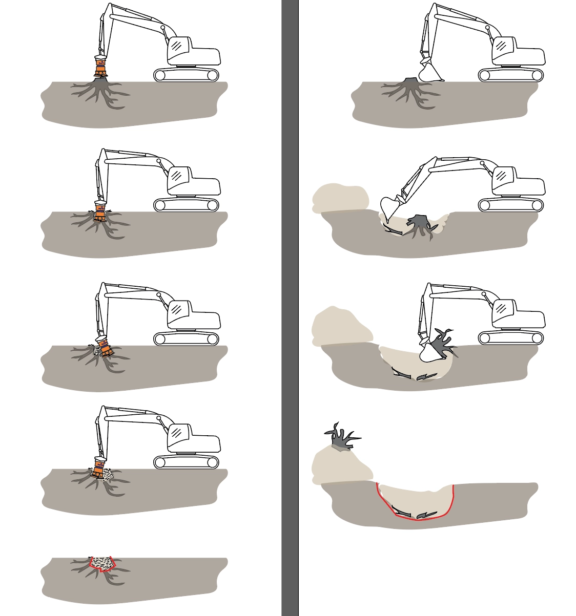 Le facteur le plus important est l’accessibilité des engins de chantier. Si les souches sont creusées, les cratères devront être comblés pour permettre l’accès des machines, qui utilisent des roues au lieu de chenilles. De plus, le remplissage des casiers endommage la couche protectrice des racines du gazon.