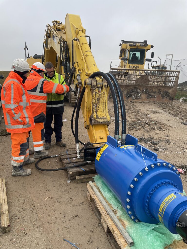 - Jour 1 : Configuration de l’ensemble et réglages hydrauliques sur la pelle. Ce travail a permis d’assurer une connexion parfaite entre le porteur et le moteur de tarière 100.000 MAX Auger Torque, garantissant sécurité, performance et compatibilité.