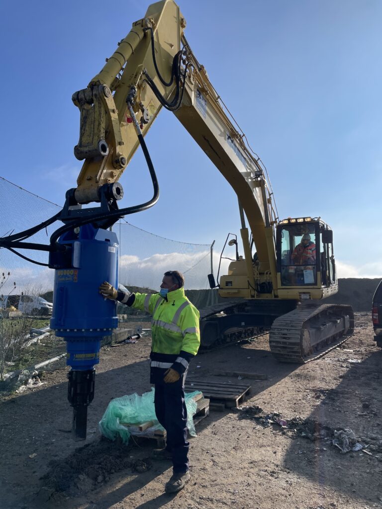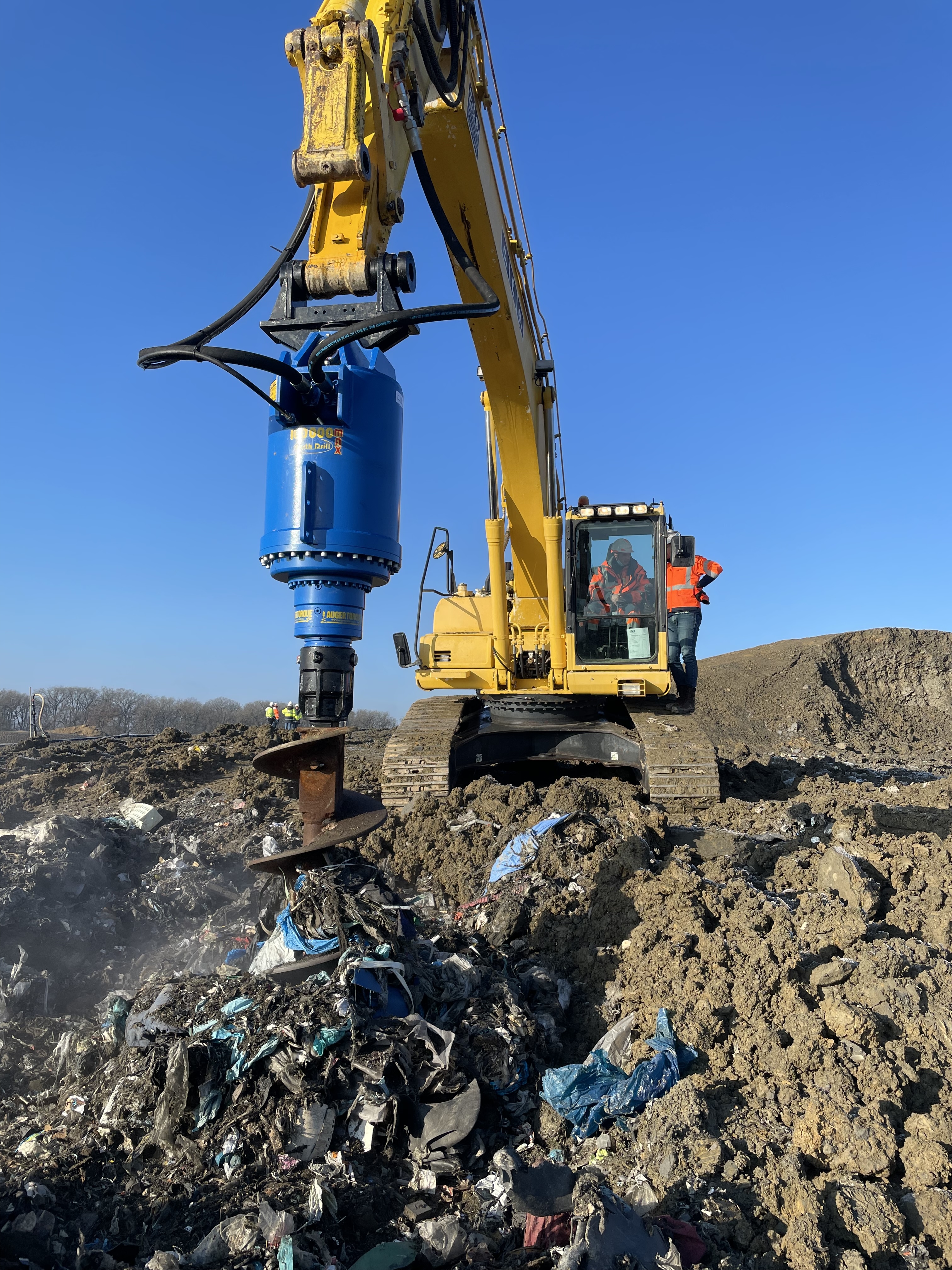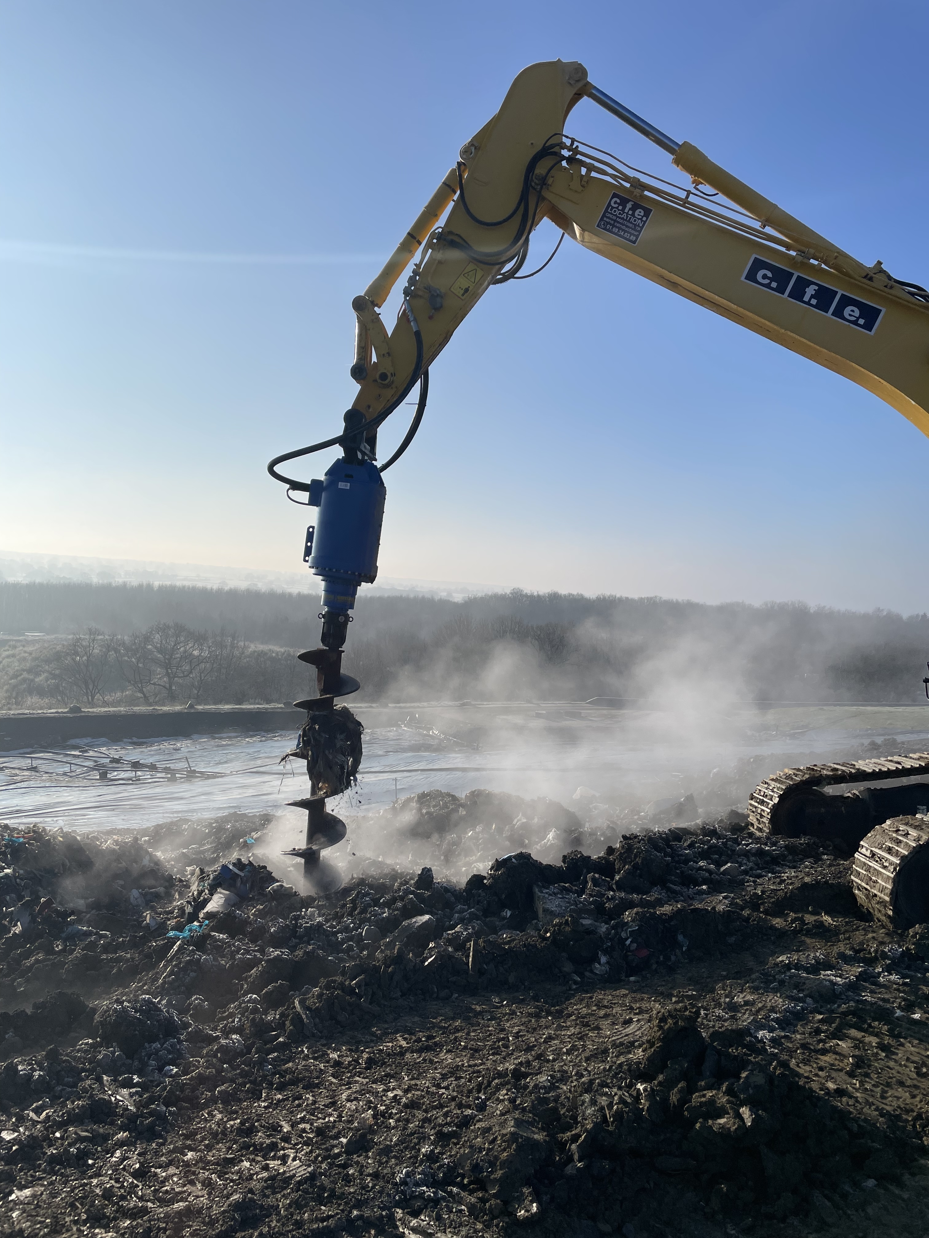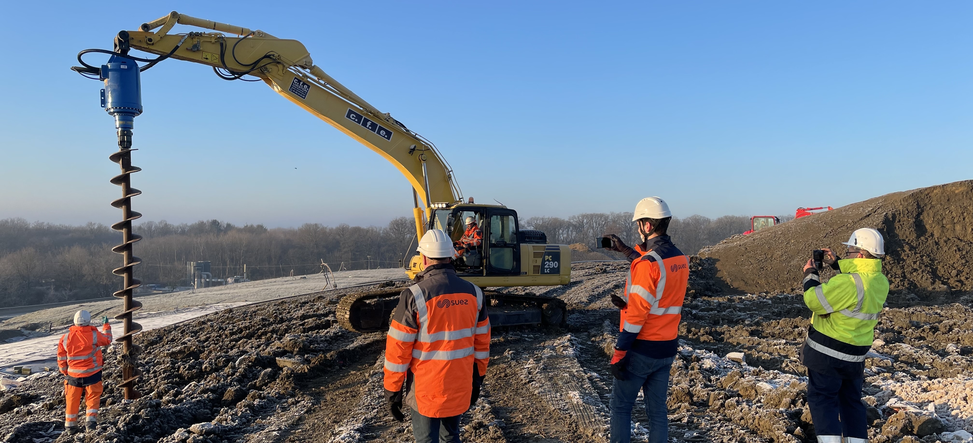 Montée sur une KOMATSU PC290, la tarière a démontré toute sa puissance et sa fiabilité en accompagnant efficacement le forage du premier puits destiné à la récupération de biogaz issu de la décomposition des déchets. Une étape clé dans la valorisation énergétique des déchets, au cœur des engagements de SUEZ.