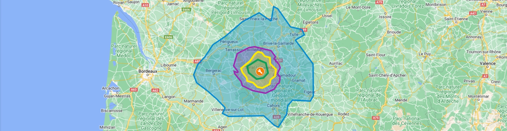 Consultez la carte ci-dessous pour connaître votre zone de dépannage et les tarifs associés ou appelez-nous directement !