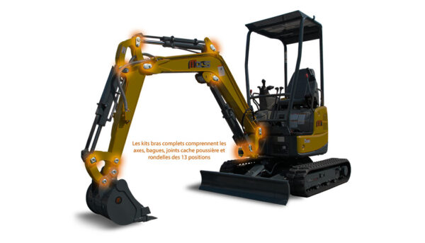 KIT SPECIAL AXES ET BAGUES Pour les positions de 1 à 13 Comprenant: - 14 axes - 29 bagues - 26 joints - 12 rondelles - 2 goupilles Dimensions à vérifier si attache autre que standard 2 axes: diamètre 45mm - longueur dessous la tête jusqu'au bout 258mm - AXE GRAISSE