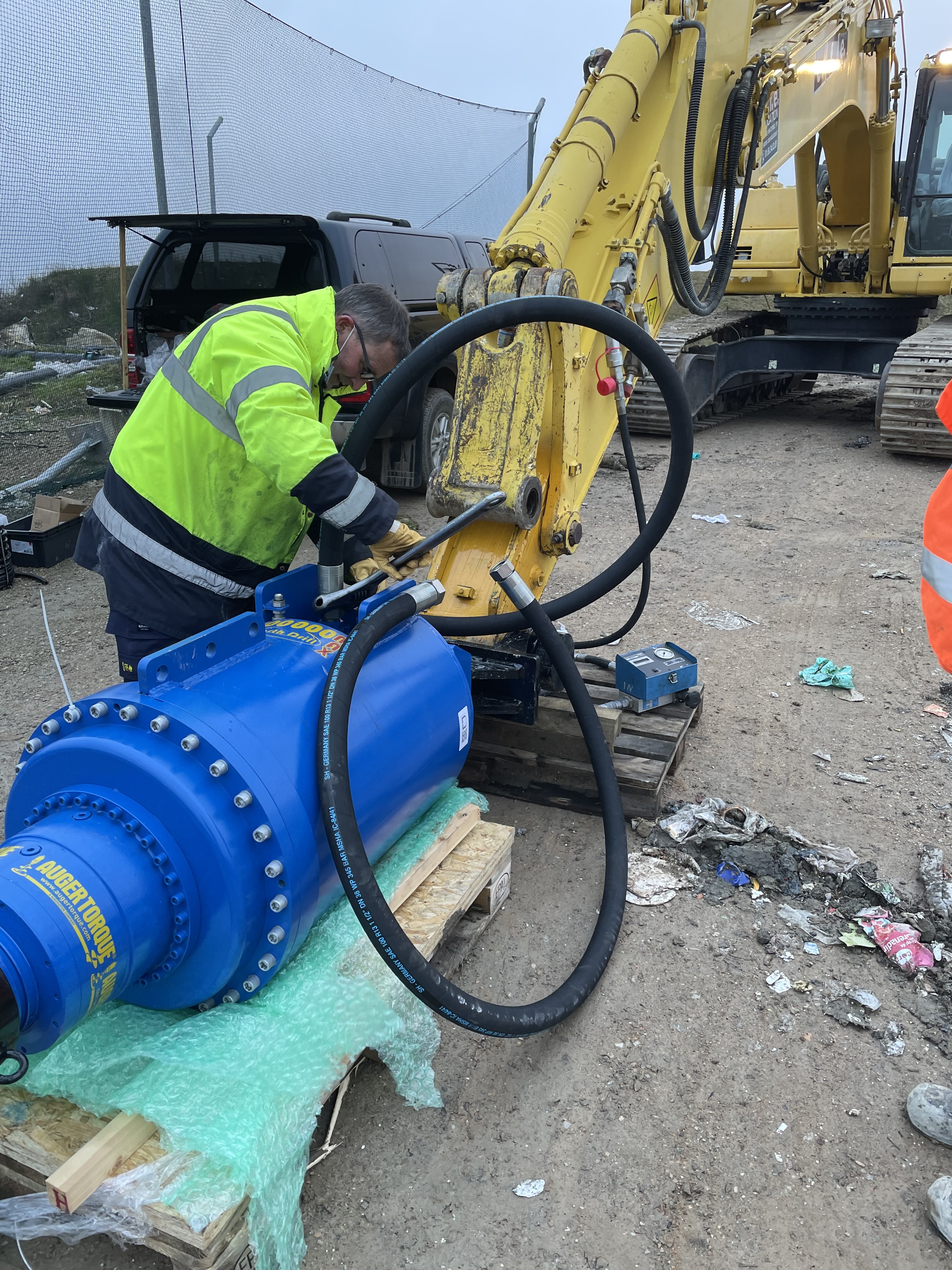 - Jour 1 : Configuration de l’ensemble et réglages hydrauliques sur la pelle. Ce travail a permis d’assurer une connexion parfaite entre le porteur et le moteur de tarière 100.000 MAX Auger Torque, garantissant sécurité, performance et compatibilité.