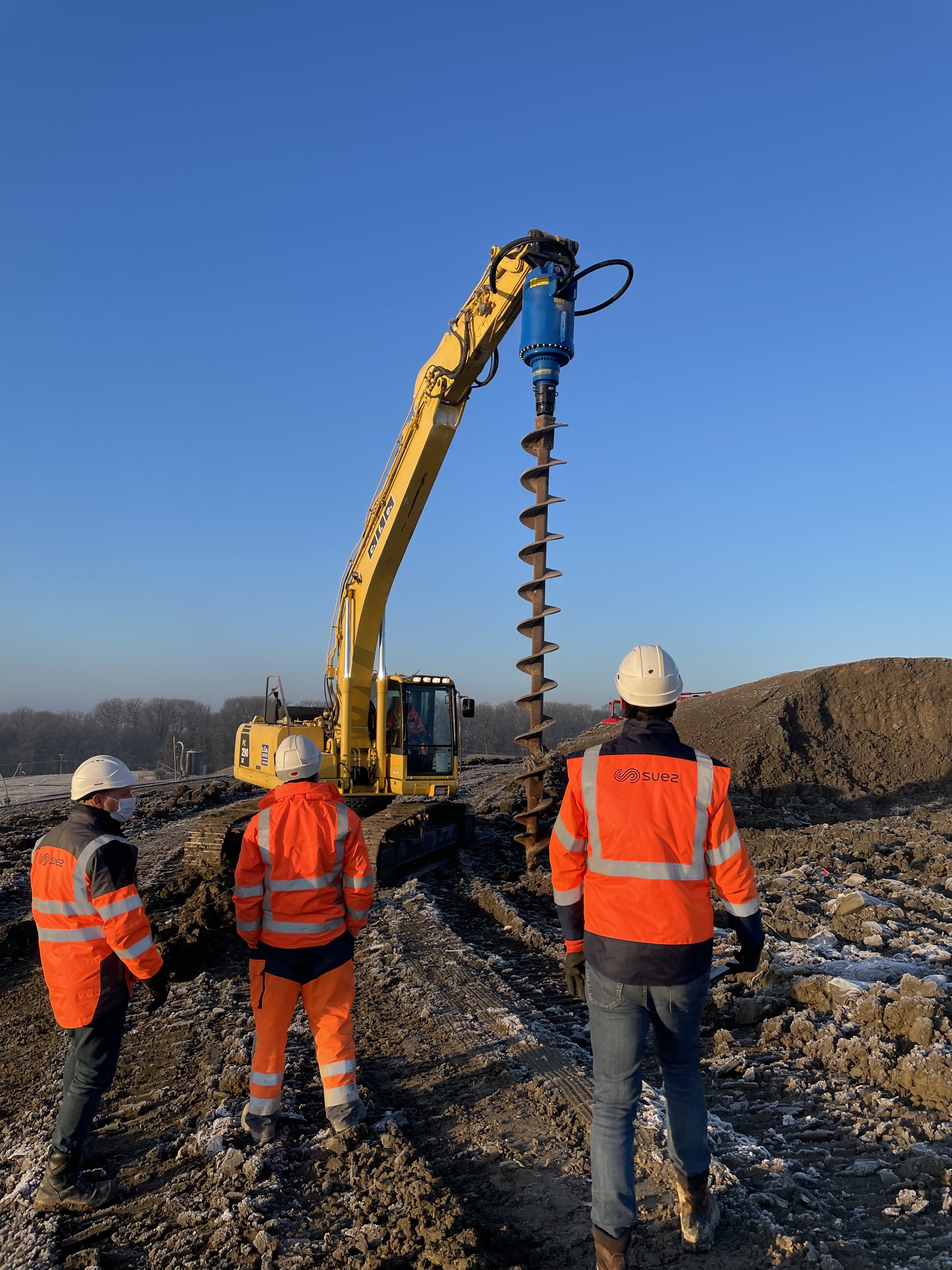 Montée sur une KOMATSU PC290, la tarière a démontré toute sa puissance et sa fiabilité en accompagnant efficacement le forage du premier puits destiné à la récupération de biogaz issu de la décomposition des déchets. Une étape clé dans la valorisation énergétique des déchets, au cœur des engagements de SUEZ.